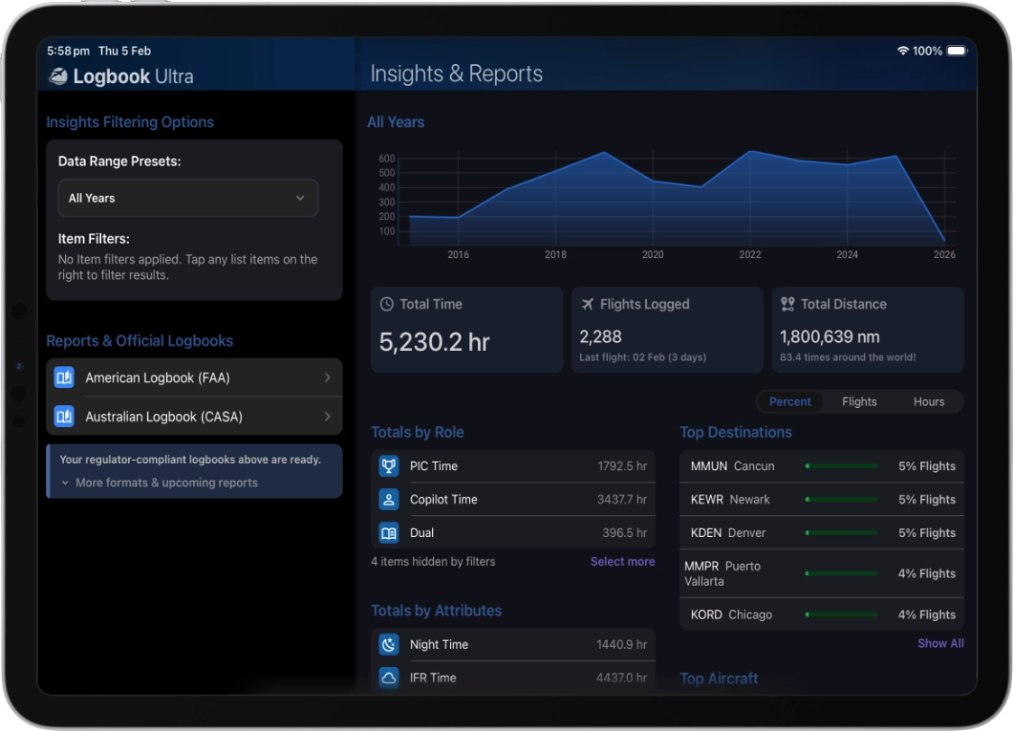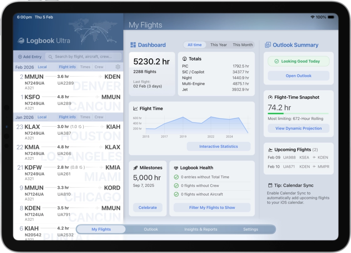 Totals, recent activity, upcoming flights, milestones, and logbook health - all in one place.